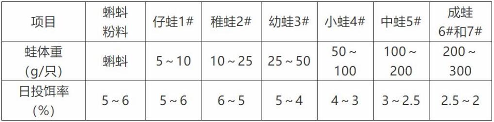 ? 根据蛙规格及数量,参考投饵参考表中推算投饵量,再根据天气、水温、水质、饵料台观察情况、蛙摄食和健康状况等予以适当调整。