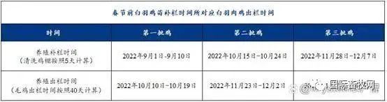 其次,从春节前白羽肉鸡出栏批次来看,结合白羽肉鸡主产区山东市场的情况,毛鸡养殖出栏时间按照40天计算,清洗鸡棚时间按照5天计算,那么从9月份至春节前最大极限可出三批鸡,第一批鸡的补栏时间约从2022年9月1日至9月10日;第二批鸡补栏阶段约在2022年10月15日至10月24日;第三批鸡补栏时间或在2022年11月28日至12月7日。